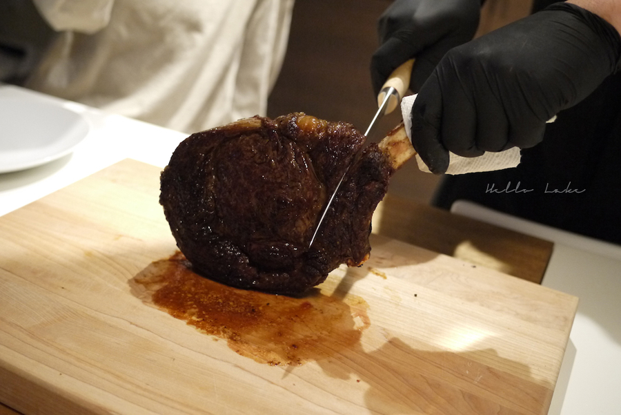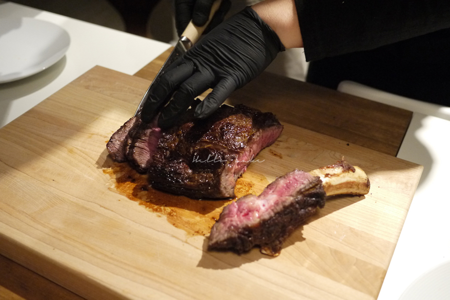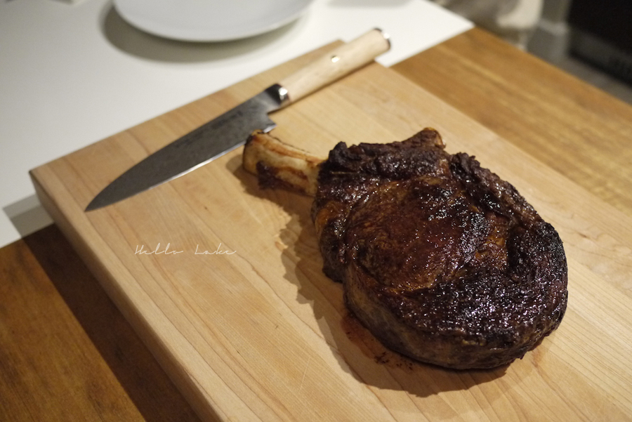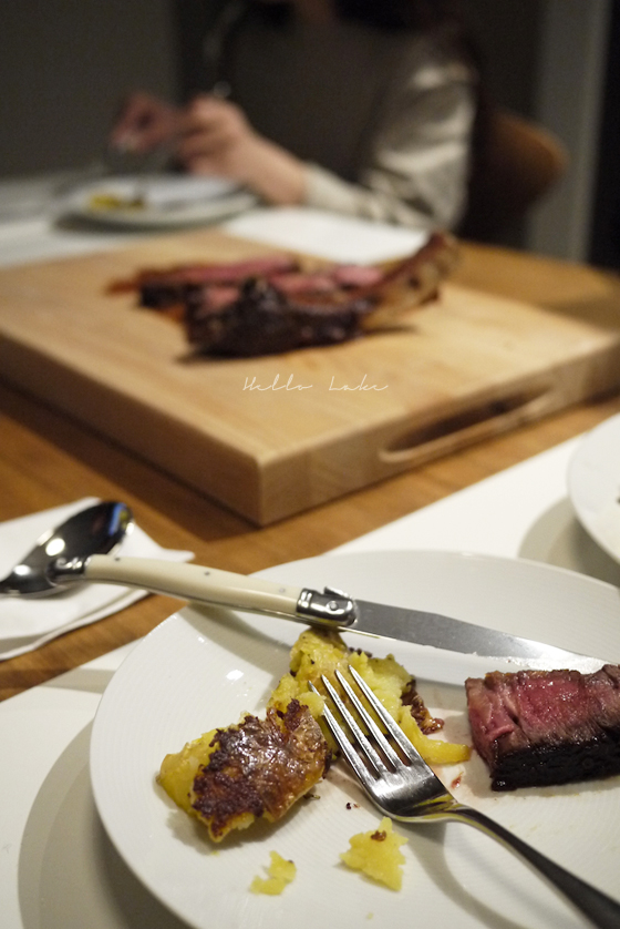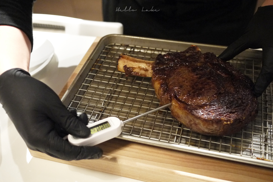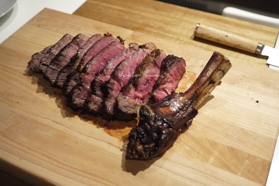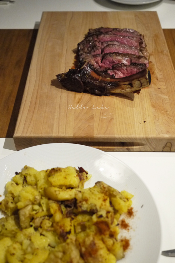 무쇠팬에 굽던 스테이크는 속 온도를 체크하고, 다시 오븐에 잠시 들어갔다 나왔다. 뭔가 저분, 출장요리 나온듯한 포스.